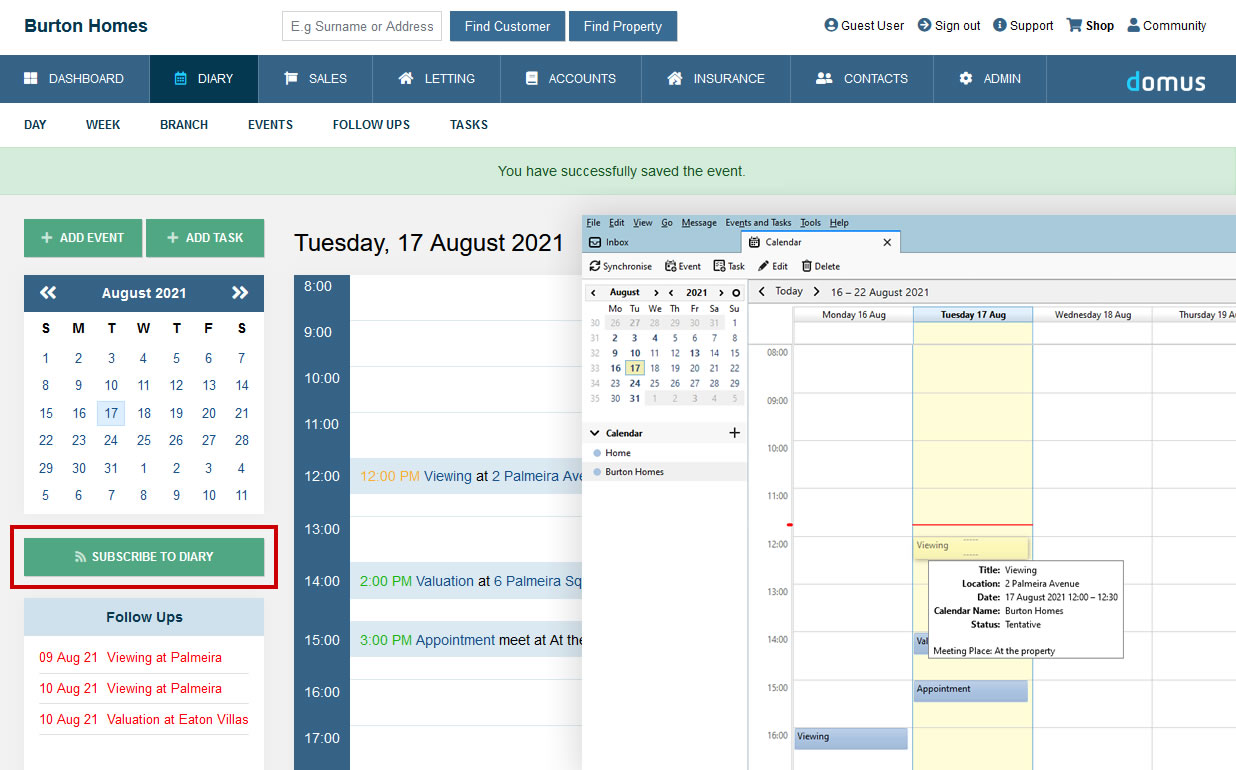 You can now sync your Domus diary to Outlook Desktop, Apple Calendar, Thunderbird and other diary applications.