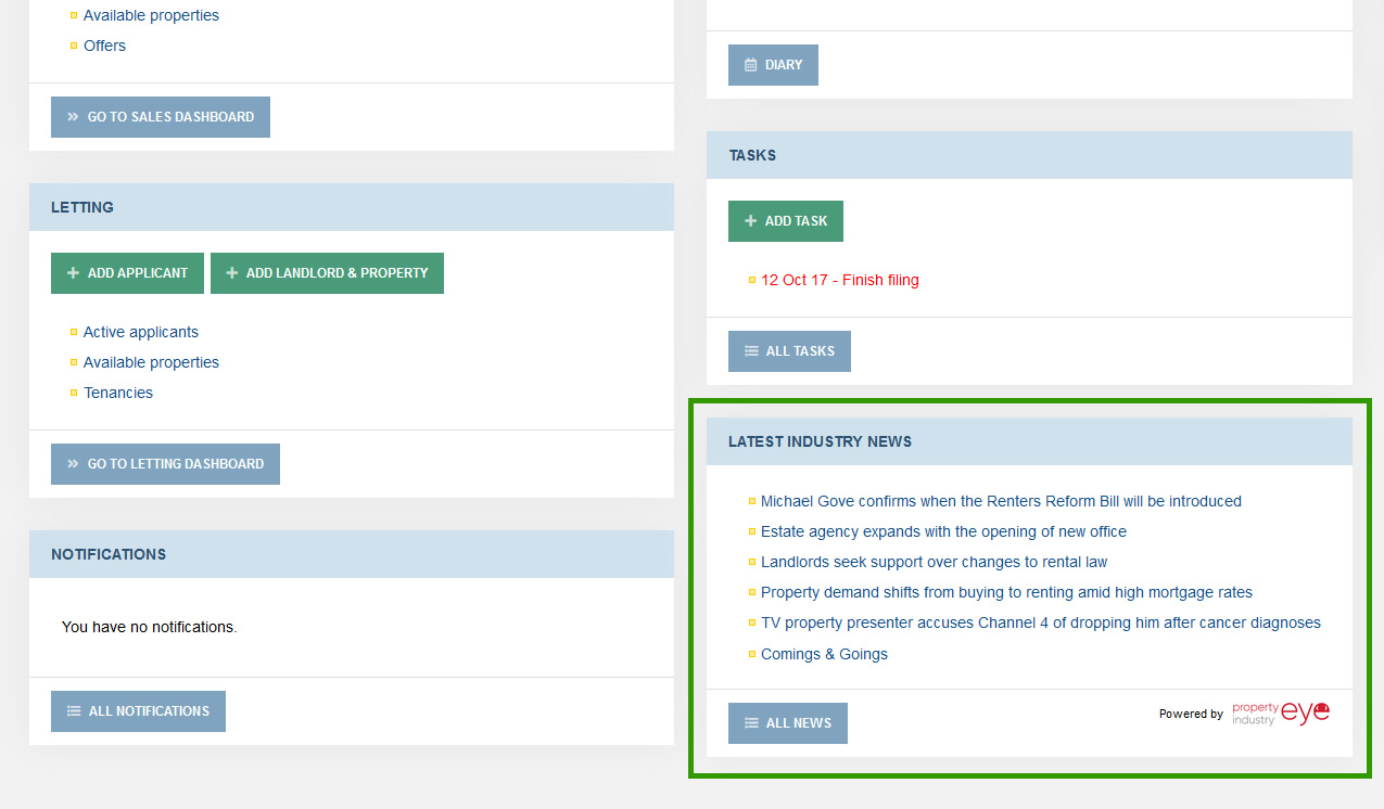 Easily keep an eye on the latest property industry news from within Domus. We have just added an industry news panel to the dashboard which is powered by Property Industry Eye.