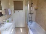 5' 10'' x 7' 2'' (1.8m x 2.2m) Frosted double glazed window to rear, panel enclosed bath with wall mounted power shower and mixer tap, glass shower screen, ceramic tiled flooring, low level w/c, tiled walls.