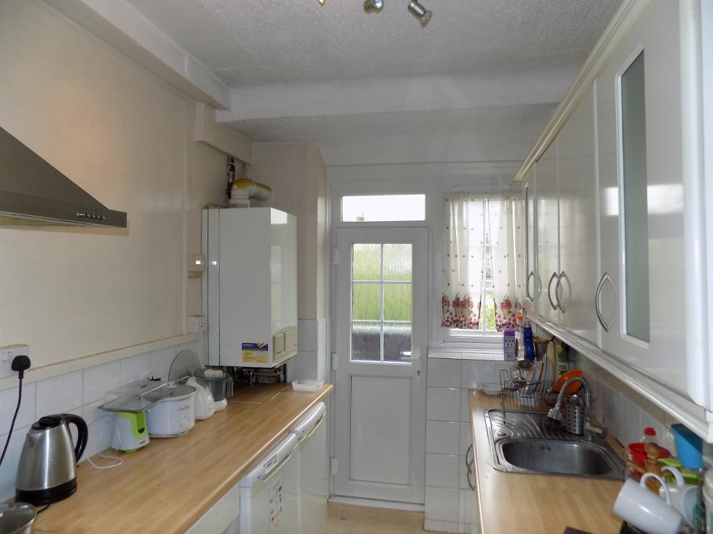 9' 9'' x 6' 5'' (3m x 1.98m) Double glazed Georgian style window to rear, part frosted double glazed UPVC door to balcony, range of fitted wall and base units, stainless steel single drainer sink and mixer tap, chrome chimney exterior, plumbing for washing machine, roll edge worktops, wall mounted boiler and localised tiling.