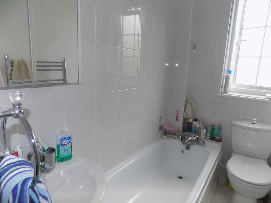 7' 10'' x 5' 4'' (2.39m x 1.63m) Frosted Georgian style double glazed window to rear, panel enclosed bath with mixer tap and shower attachment, low level w/c, wash pedestal hand basin, localised tiling, and radiator.