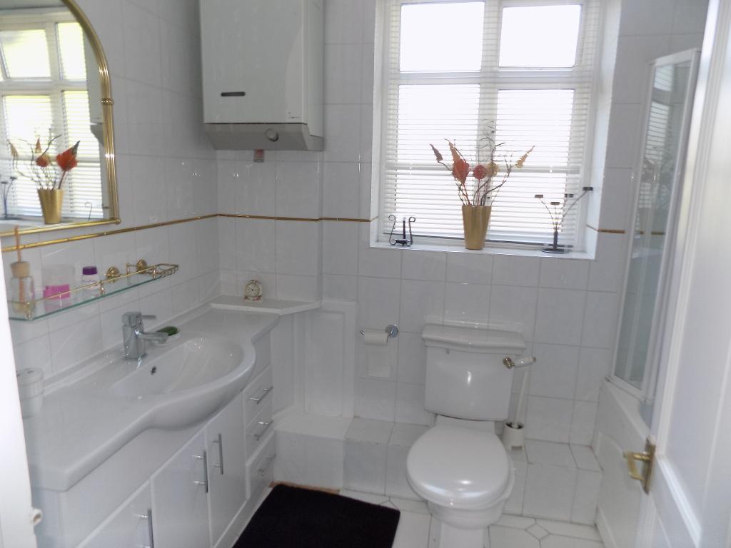 7' 7'' x 4' 3'' (2.33m x 1.31m) Double shower cubicle via glazed door, wall mounted power shower, low level w/c, wash hand basin, single radiator, extractor fan, tiled walls and floor.
