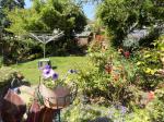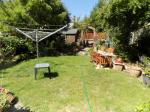Patio area with awning over, timber shed, greenhouse, further block paved patio, shrubs to borders, outside tap, apple tree, laid to lawn.