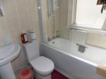 Frosted double glazed window to side, panel enclosed bath, wall mounted shower, shower screen, low level w/c, wash pedestal hand basin and mixer tap, carpet, single radiator, tiled walls, extractor fan.