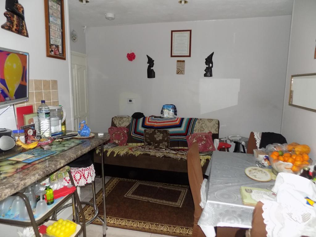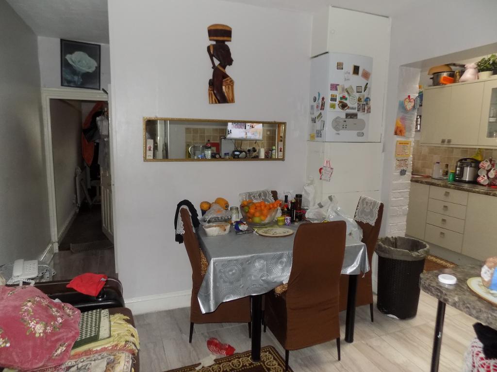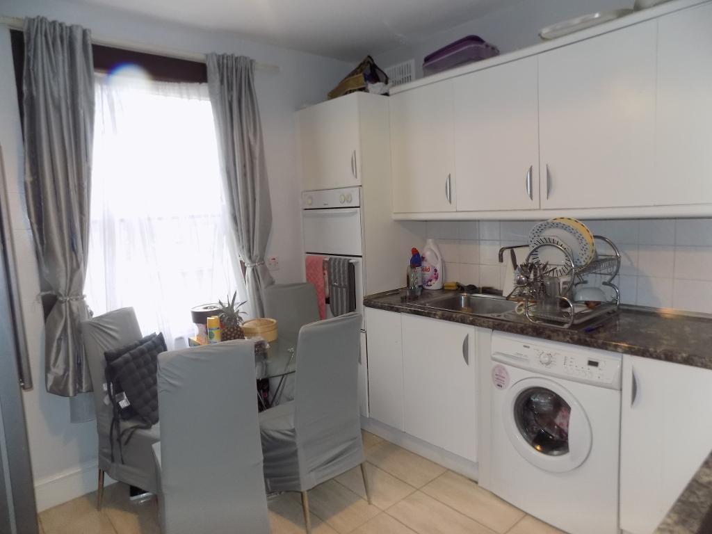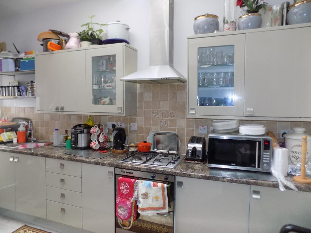 Double glazed to rear, single radiator, ceiling rose, range of fitted wall and base units, stainless steel single drainer sink and mixer tap, plumbing for washing machine, chrome chimney extractor fan, insert gas hob, tiled floor, built in electric double oven.
