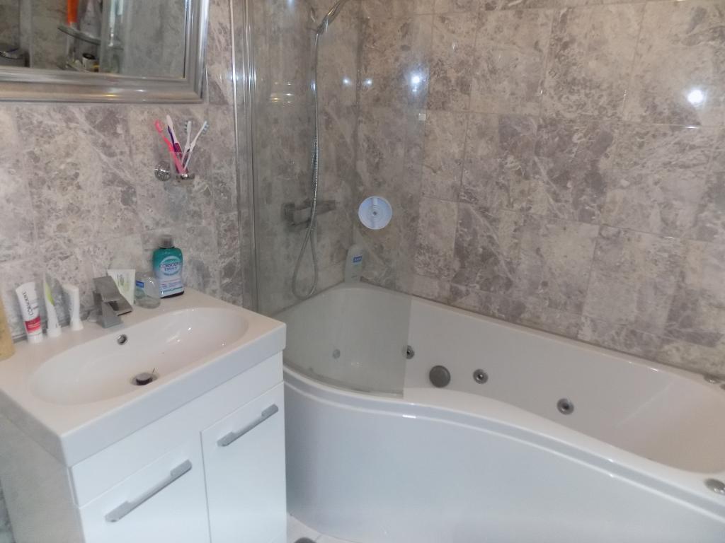 8' 0'' x 6' 10'' (2.45m x 2.1m) Frosted double glazed window to side, Jacuzzi jet steam bath, wall mounted dual power shower, low level w/c, wash pedestal hand basin, vanity unit with mixer tap, built in cupboard, heated towel ladder radiator, tiled floor, low level w/c.