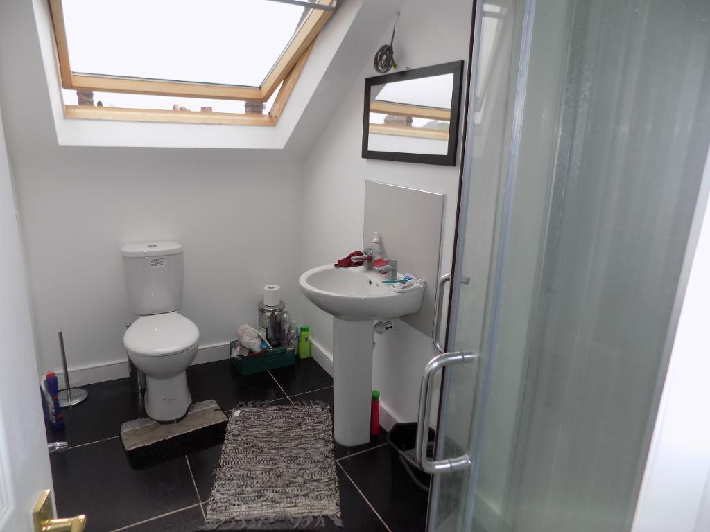 Double glazed velux window to front, low level w/c, wash pedestal hand basin, extractor fan, enclosed shower cubicle, dual head wall mounted power shower, tiled floor, heated towel ladder radiator.