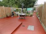 Large concrete patio, path to side, laid to lawn, shrubs to borders, outside tap, security lighting, shed.