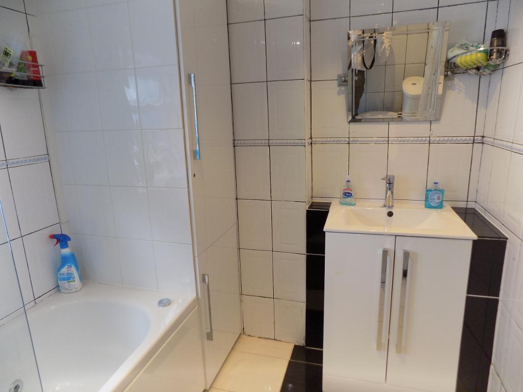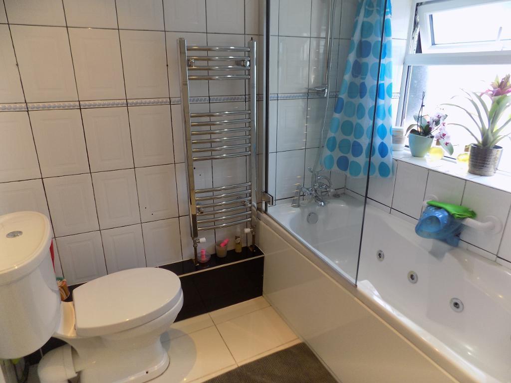 Tiled flooring, panel enclosed bath with mixer taps and shower attachment, low level w/c, double glazed window to rear.