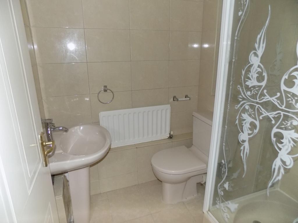 Extractor fan, enclosed shower cubicle, wall mounted shower, wash pedestal, hand basin, low level w/c and tiled walls and floor.