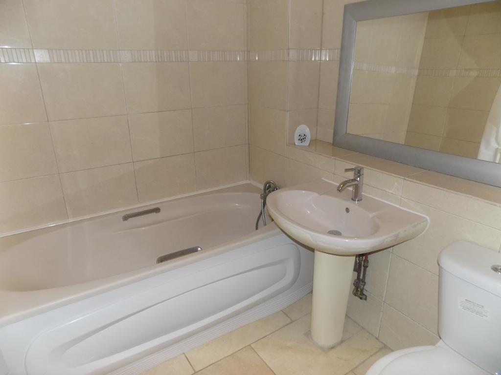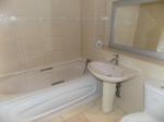 Extractor fan, panel enclosed bath with mixer tap and shower attachment. Low level w/c, tiled walls and floor.